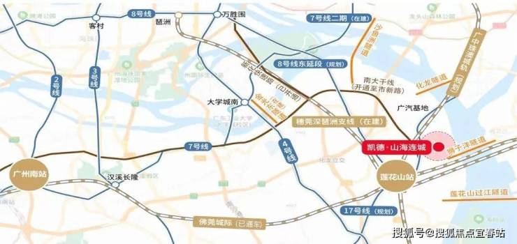 距离项目2.5公里处有莲花山站,佛莞肇城际已经开通运营了,3 站到长隆万博,4 站到广州南站。另外佛莞深城轨琶洲支线还在建设中,(2 站到大学城,3 站到琶洲)以及广中珠澳城轨(规划中)和8号线地铁的东延段(预计2028年通车)。