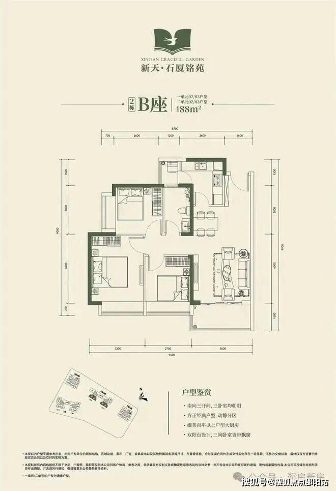 2栋B座一单元02、03户型、2栋B座二单元02、03户型:面积约为88㎡的3房2厅1卫;