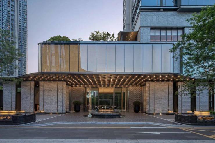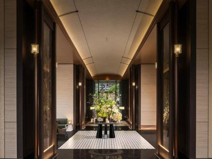 酒店式社区大堂:朝向广场,入口前场、门廊、大堂、内庭院、单元大堂组成的归家动线,配合建筑、景观、室内、标识、灯光一体化设计,汲取糅合后的南洋文化元素细节,把酒店式归家仪式感拉满,彰显非凡气度。