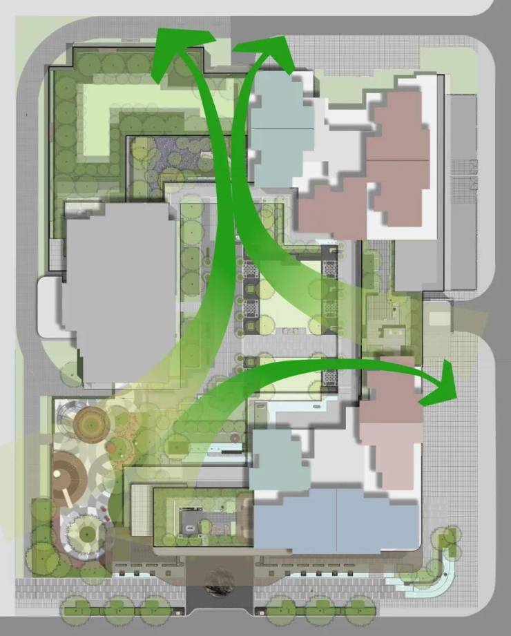 微风绿谷:沿内部庭院设置一圈风雨连廊,形成廊下漫游空间,实现近人空间的游走体验,提供丰富的檐下生活场景;小区庭院东、南、北三个方向均设置有架空等开敞空间,有利于改善气候条件,形成对流风。这些也都体现出浓厚的岭南建筑的空间特色。