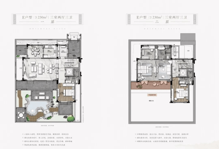 【建筑面积230方】庭院90-100方,地下室200-300方,总价900-1100万。