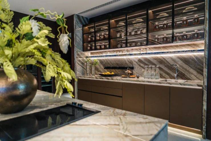 另外在用材上,门厅、客餐厅地面均采用了浅色系大理石,西厨吧台更是匹配了符合空间调性的东方木纹与龙飞凤舞石材,独特的纹理和质感提升了厨房品质与艺术性,颜色也与厨房整体风格达到和谐统一。