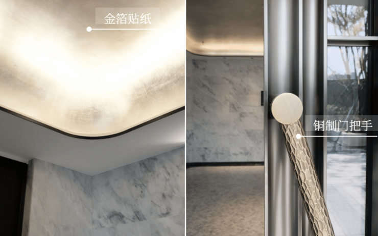 穹顶是特意做成弧形转角再由工艺师傅用金箔纸一片片粘贴,门把手也呈现出实心捶纹铜的圆弧状