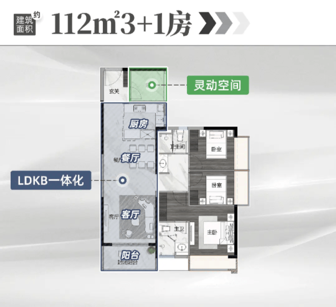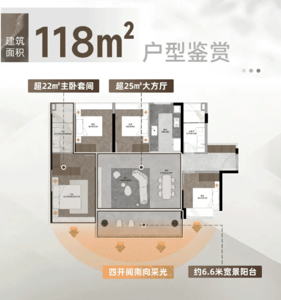 R5、R6 栋加推的 118㎡四房采用 LDKB 一体化设计,带有超 8㎡多功能空间,125㎡四房为南北对流,主卧带 270° 环幕飘窗。
