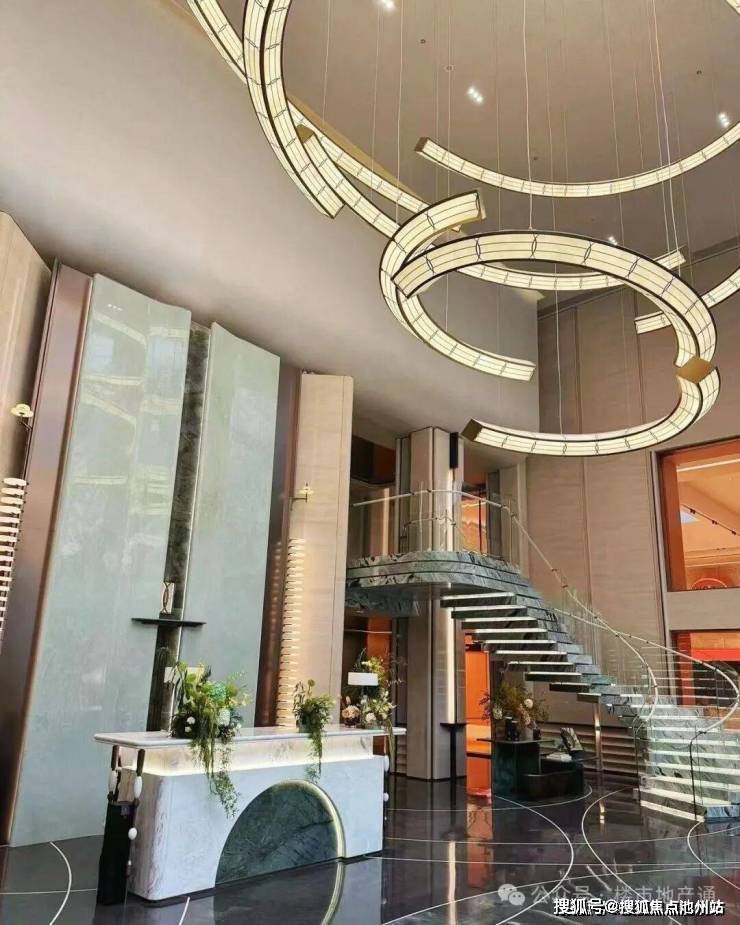 归家入户大门:门头宽40米,高度超11米,抬高之后大门更气派了,大面积的水景+两侧铁冬青、桂花树等搭配,吊顶由207块弧形铝板拼接而成,上方还有露天观景平台,整体大门风格有点像绿城平安桥TOD项目,奢石含量很高