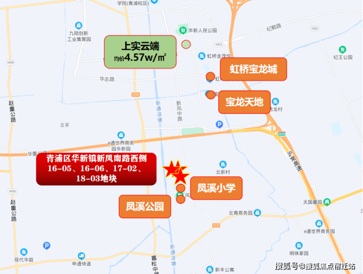 项目地块位于青浦区华新板块,周边暂无轨道交通,商业有虹桥宝龙城、宝龙天地,学校有凤溪小学等。项目周边新房有上实云端,均价4.57w/㎡。