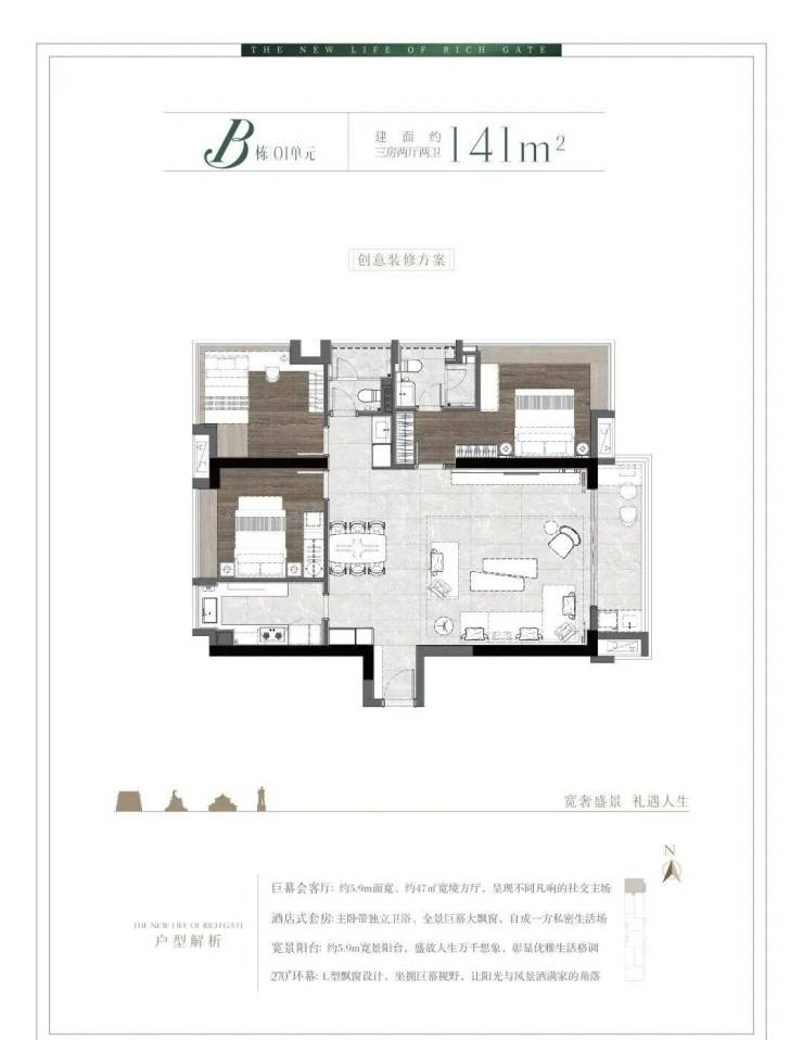 2梯3户全屋对流板式设计,通风采光俱佳,在城芯显得弥足珍贵;LDKG一体化奢阔大方厅、L型飘窗270°巨幕视野等设计,满足家庭成长的改善居住需求,诠释阔绰宽境大家风范。