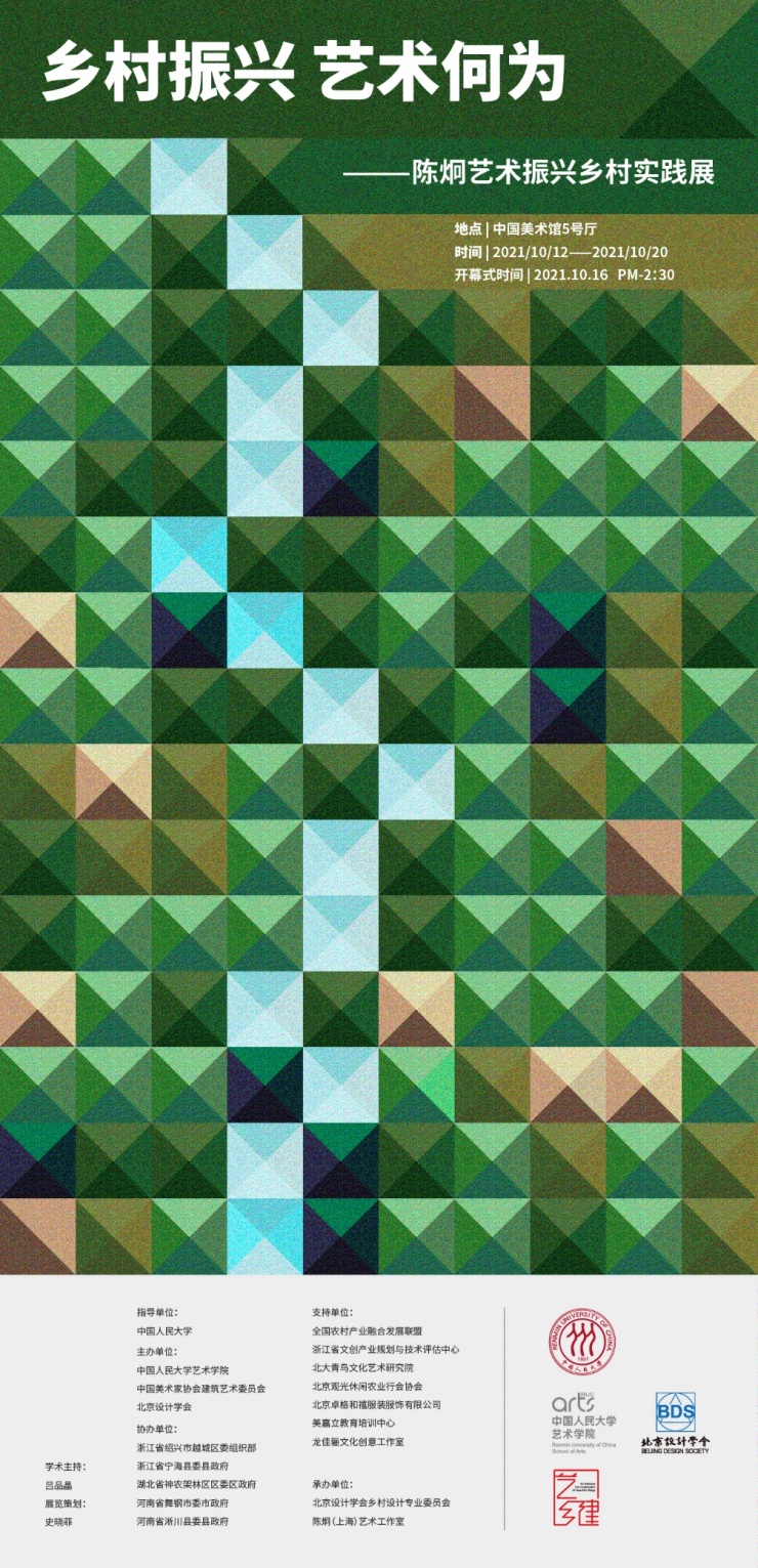 乡村振兴,艺术何为?在庆祝中国共产党建党100周年的日子里,在巩固拓展脱贫攻坚成果同乡村振兴有效衔接的当口,于2021年10月12日—10月20日,由中国人民大学作为指导单位,中国人民大学艺术学院、中国美术家协会建筑艺术委员会、北京设计学会联合主办的“《乡村振兴 艺术何为》——陈炯艺术振兴乡村实践展”将于中国美术馆(五号厅)举办,开幕式时间:2021年10月16日下午2:30。