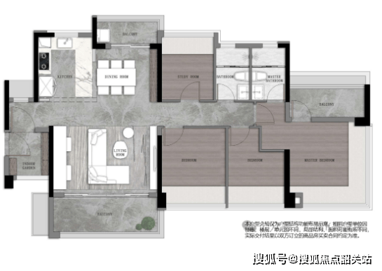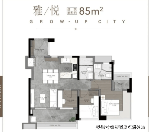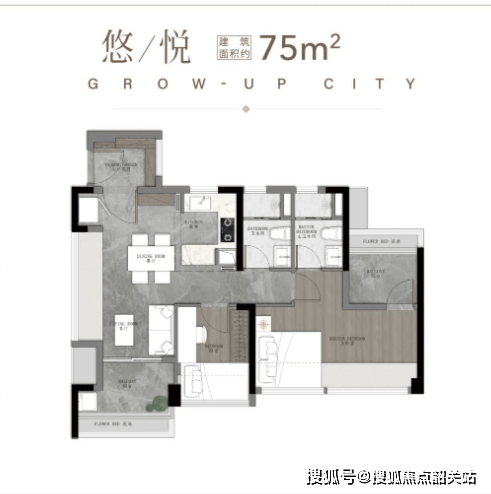 75㎡三空间两卫:适合年轻人主城上车,四开间朝南,全明转角玄关,开放式厨房搭配开阔景观阳台,南北对流主套及衣帽间,空间布局合理。