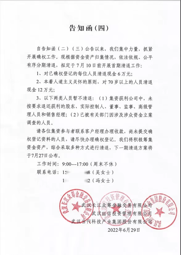 6月29日,焦点财经获悉,当代系发布了较新告知函,拟于7月10日前开展首期清退工作,针对不同人群,清退现金分别为6万、12万。
