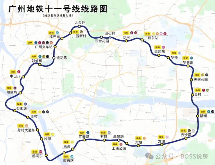 11号线是广州首条市区大环线,串联广州中心五区,与广州现有及未来的所有地铁实现换乘,被称为“换乘之王”虹吸全广州的优质资源