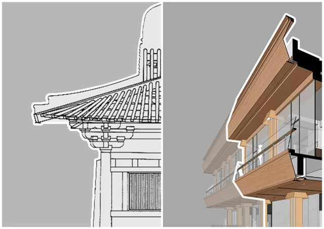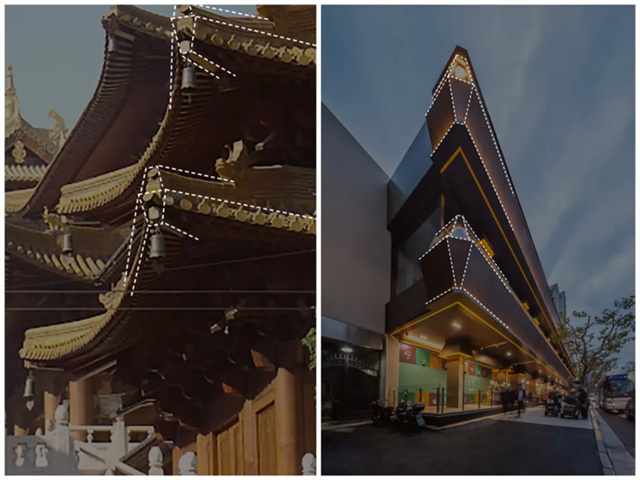 | 礼佛之心静安寺作为上海的“心脏”,而九百商场作为上海的一部分,“礼佛之心”是设计师以上海人们的信仰为灵感进行创作。建筑立面对斗拱屋檐与线条进行结合简化,材质和色彩采用与环境相协调的暗铜色。还将挑檐、斗拱进行元素简化,形成独特的设计符号。