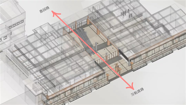 ▎九百商场纵向打通中间空间,将万航渡路和愚园路直线连通,贯穿商场两方出入口。