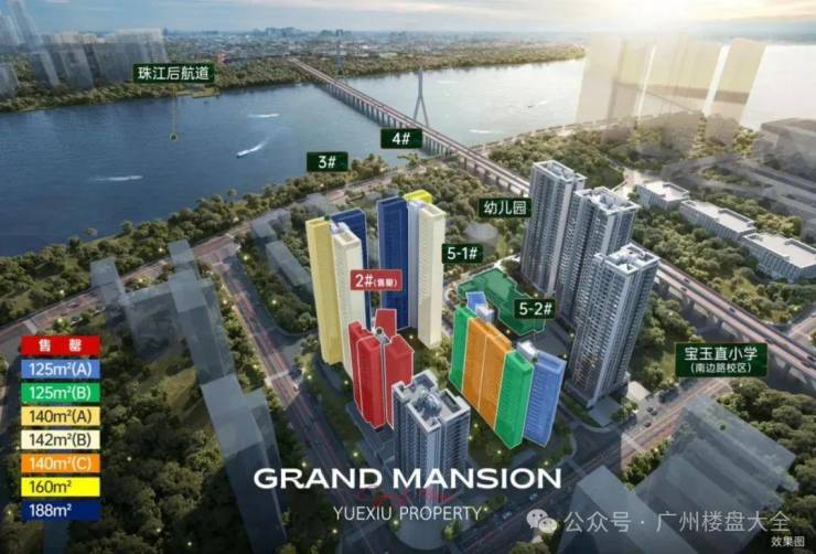 越秀江湾和樾位于广州市海珠区工业大道,珠江后航道宝玉直小学旁(南边路校区),由越秀地产、珠江实业、海珠城发三大实力房企联合开发。项目总占地面积约6.3万㎡,总建筑面积约21万㎡,容积率3.43,绿化率30%,规划8栋塔楼、3栋商业、1所幼儿园,共1313户,产权70年,预计2025年底至2026年中精装交付,物业费5.26元/㎡/月。