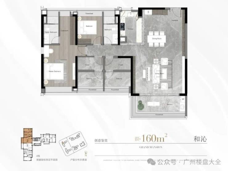 建面约160平的单位。整个户型格局与建面约188平户型类似,LDKB大方厅同样是标配,甚至主卧也保留了南北对流的设计。特别是景观面,与建面约188平的大平层同款。
