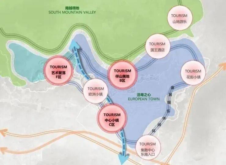 项目重点建设中心小镇C区、艺术聚落F区、伴山美地B区三大园区,并串联现状山地游乐、国王酒店、欧洲小镇与集散中心。