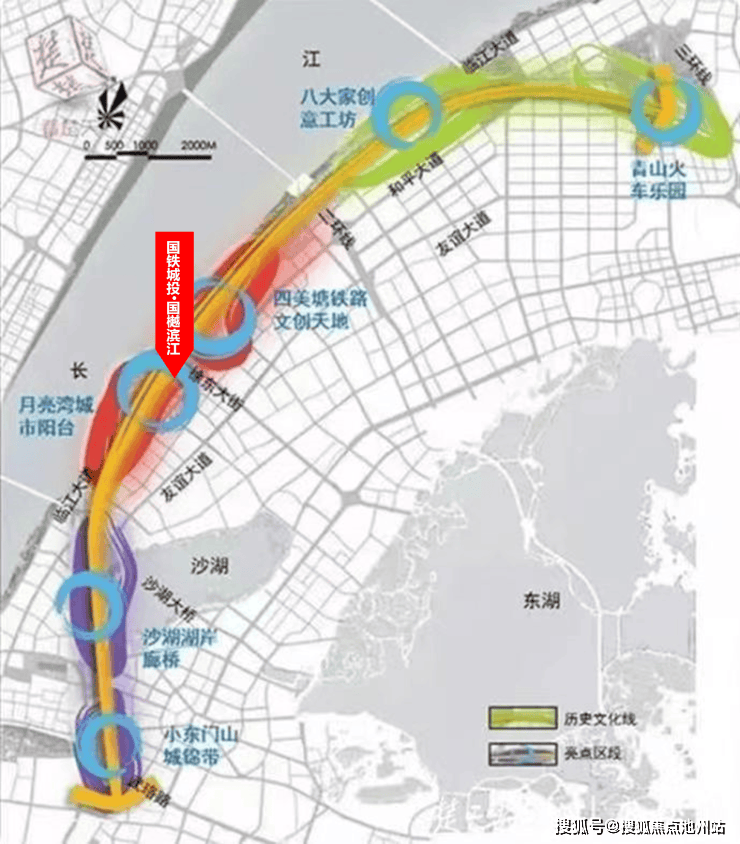 总长度13.46公里,共分为两期建设,一期工程已于2020年4月份动工修建,已于2023年完工;该项目共分为三个区段,本案所在区域为武昌滨江人文体验段,包含四美塘铁路文创天地、四美塘公园、月亮湾城市阳台等亮点。
