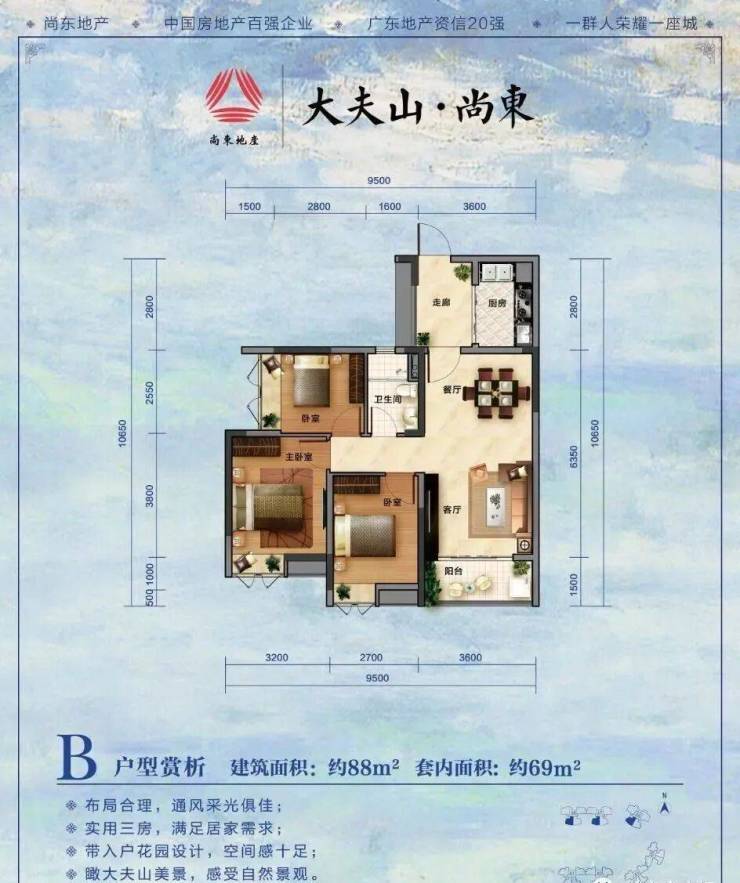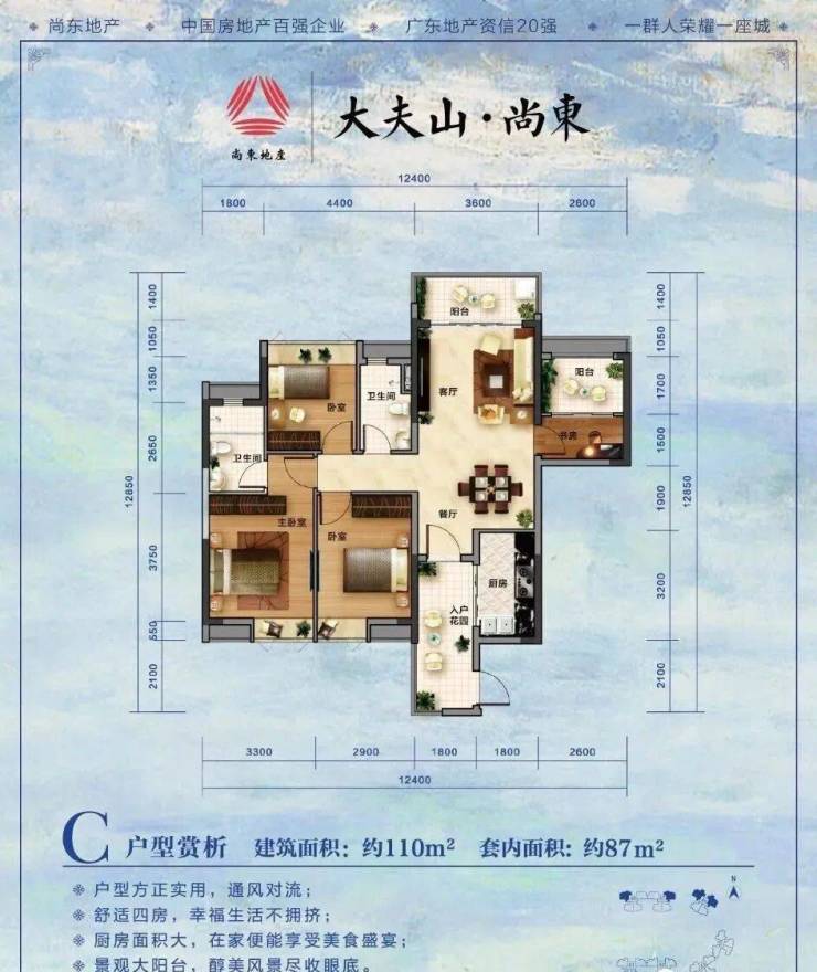 大夫山·尚东主推建筑面积约88-110平的三至四房,价格约3.5-3.6万元/㎡。