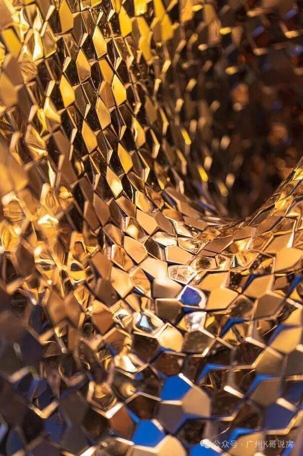 日光下,2400片电镀金鳞片组成的金鳞墙随光影流转,夜晚亮灯后与珠江水的波光交相呼应,生活的画卷就此铺展。