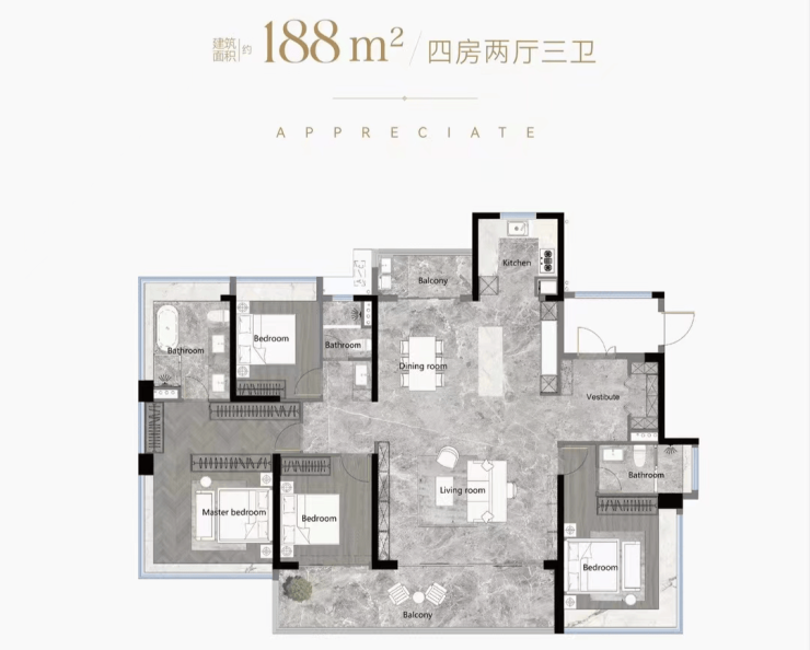 户型鉴赏(103-188平全南向四房,得房率高达126%)