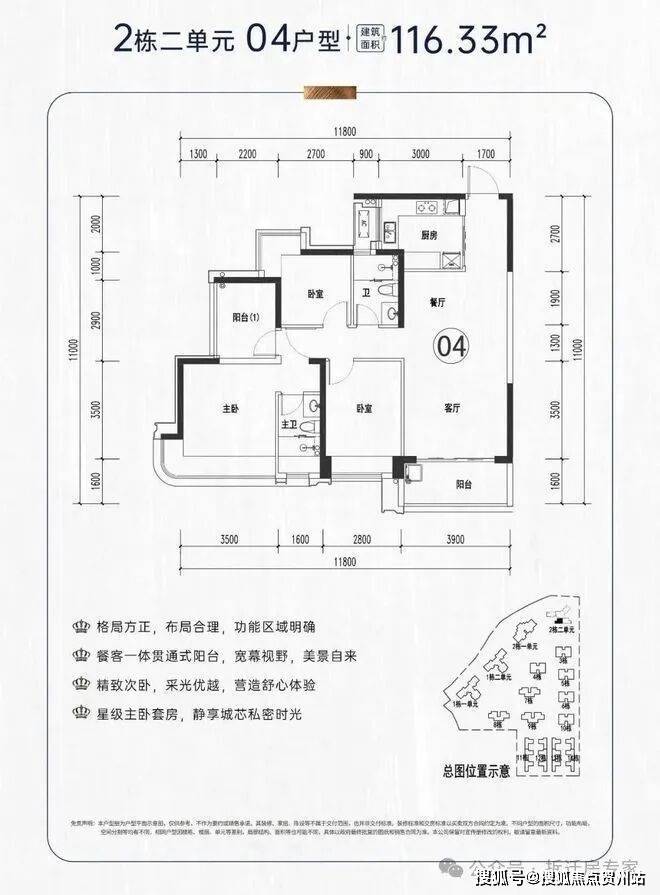 由4栋高层住宅和12栋联排别墅组成,共380套。其中,112-195㎡住宅348套,约210-300㎡双联别墅28套,楼王复式4套,南北朝向。