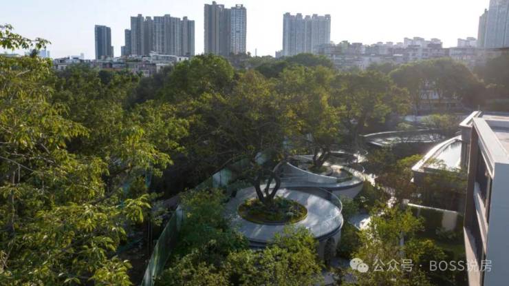 整体地块抬高约7~9米,退距约35米,形成一座隐藏在城市核心的低密浮岛,隔绝外界喧嚣。