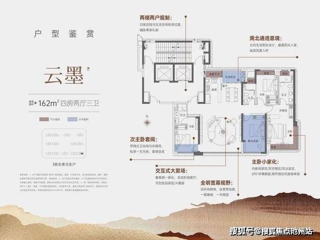 建面约162㎡四房两厅三卫,南北通透,餐客厨一体,四开间朝南,双套房设计