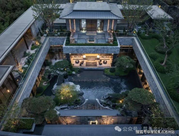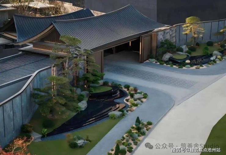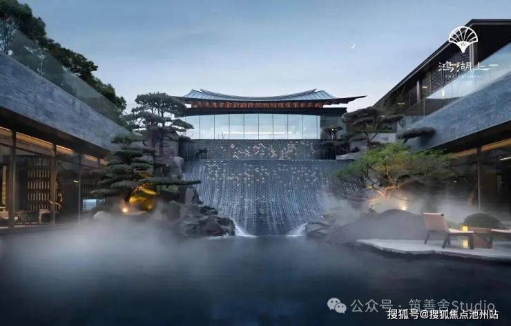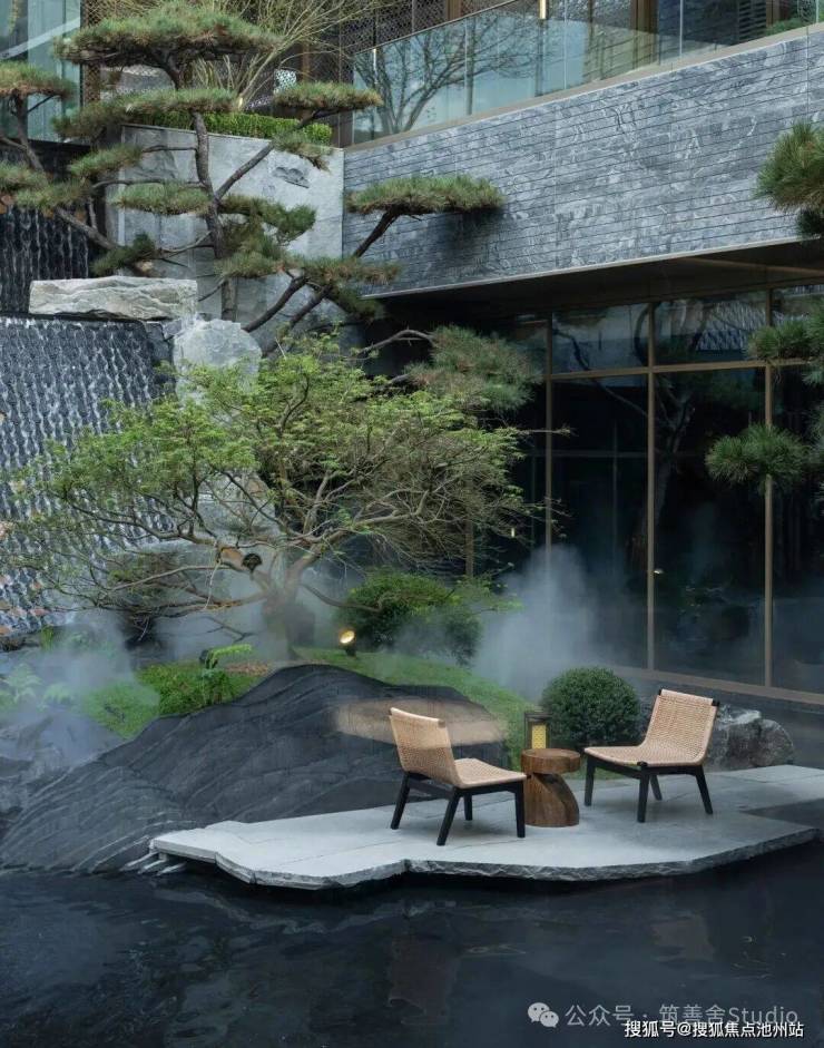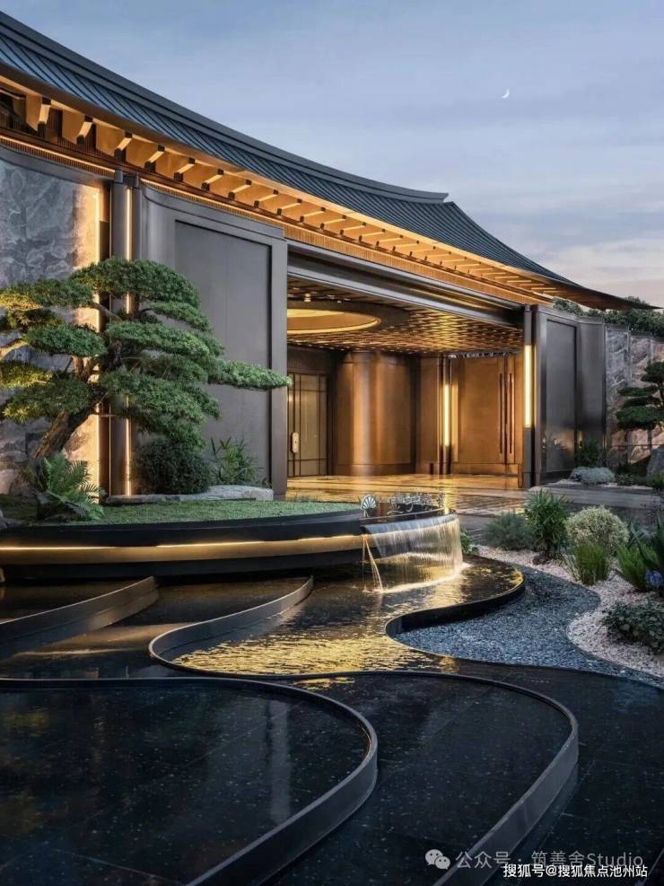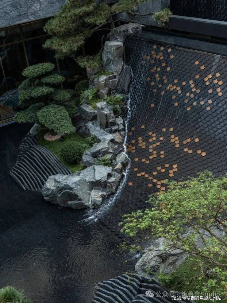 下沉庭院游廊水幕,重塑东方院落意境,九曲游廊与天地院落的匠心设计,漫步其间,光线透过窗棂缓缓流淌,仿佛让时光凝滞。黑松、羽毛枫与拙朴山石错落其间,构筑了一个充满禅意的美学空间。更令人震撼的是进门后那个5米高的水幕——水流自顶倾泻,波光闪烁,在特定光线下化作鎏金龙鳞般的瀑布,既有恢弘气势,又蕴藏悠远意境。动静相宜,堪称点睛神来之笔!