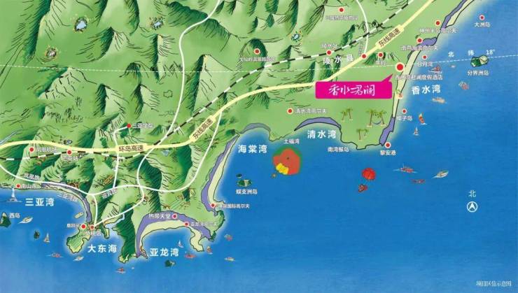 • 交通:距离三亚凤凰机场仅85公里,车程一个小时,乘坐环岛高铁仅二十分钟可以达到三亚站,同时项目距离陵水高铁站仅10分钟车程,距离海口市区约182公里,车程约90分钟
