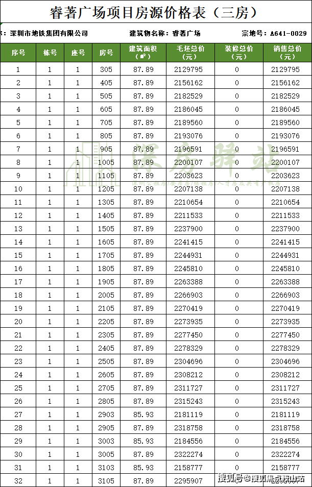 项目的批准名是“ 睿著广场 ”推广名是“深铁睿著”,宗地号为A641-0029,土地用途为商业用地+二类居住用地。项目容积率约为4.99,1栋一单元及二单元楼高约99.65米,住宅每层层高约为3米。
