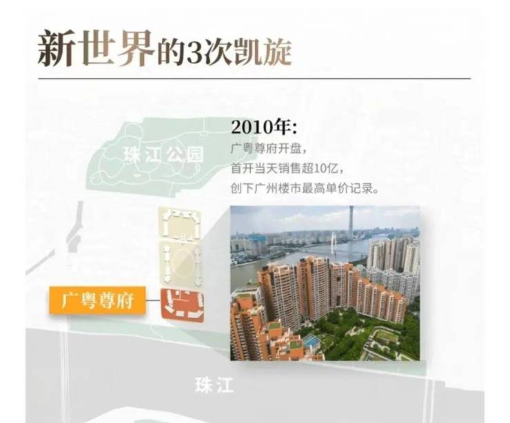 2010年,凯旋新世界广粤尊府首开,当天销售超10亿,一举创下广州楼市的最高单价纪录。也正是这一年,广州楼价达到历史巅峰,涨幅为38%。