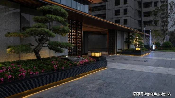 展示区西大门建设超36米宽的飞檐门庭、蟒水纹铝板、蓝眼睛花岗石自然面及仿石砖,入口精选近30万黑松,处处流露着雅致的东方人文气韵。