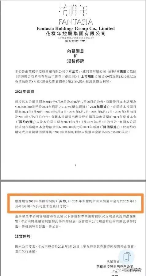 10月4日晚间,花样年控股(01777.HK)公告,公司本应在10月4日付款的205656000美元的票据未能如期支付。