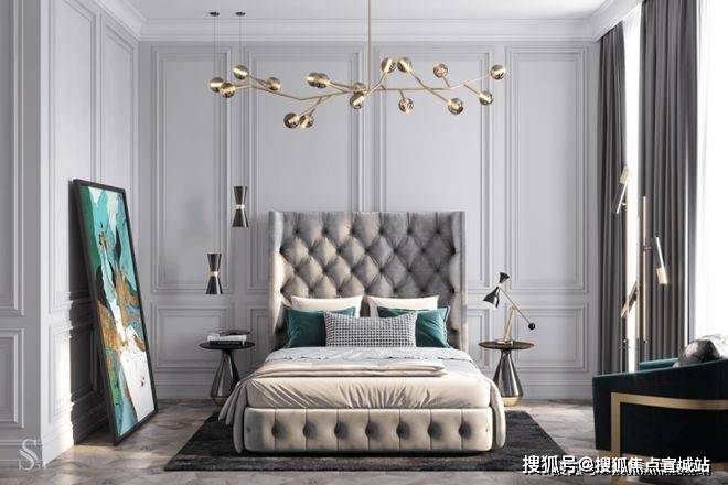 主卧室的设计简洁明了, 房间里没有多余的设计,床上悬挂着迷人的Serip枝形吊灯,而床头柜和沙发床则是由Flex Form设计的。