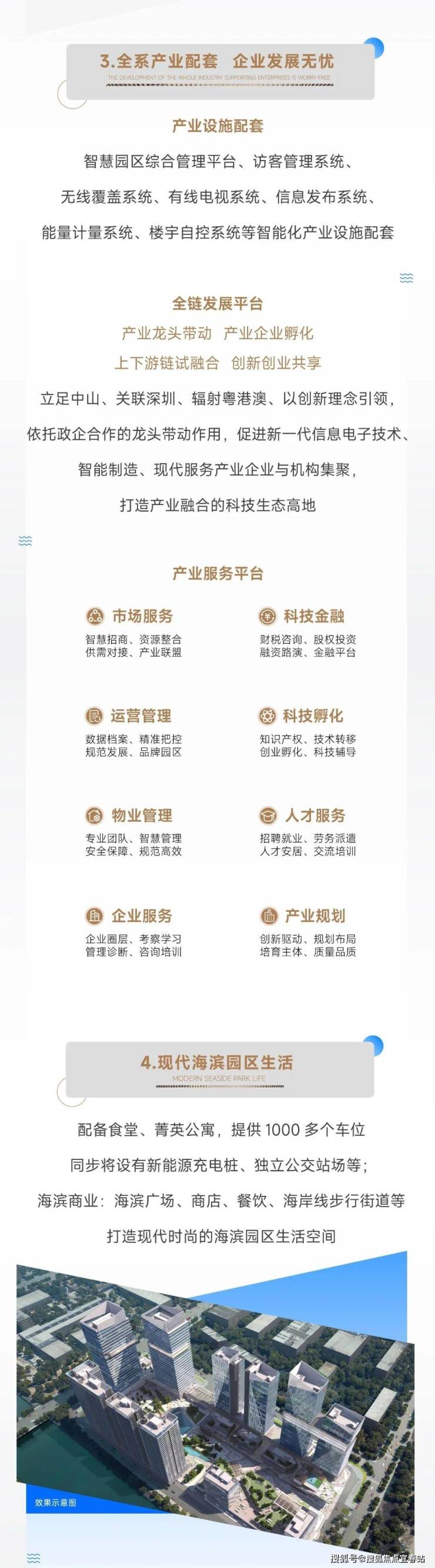 湾区未来科技城是广东省重点建设项目、中山市重点产业平台项目,建设历时4年多。园区紧邻深中通道登陆点,占地面积约113亩,总建筑面积约38万平方米,总投资约27亿元,拟打造产业全生命周期企业办公集群和配套生活空间,物业形态包括约21万平方米产业研发用房、约9万平方米生活宿舍和滨海商业配套。