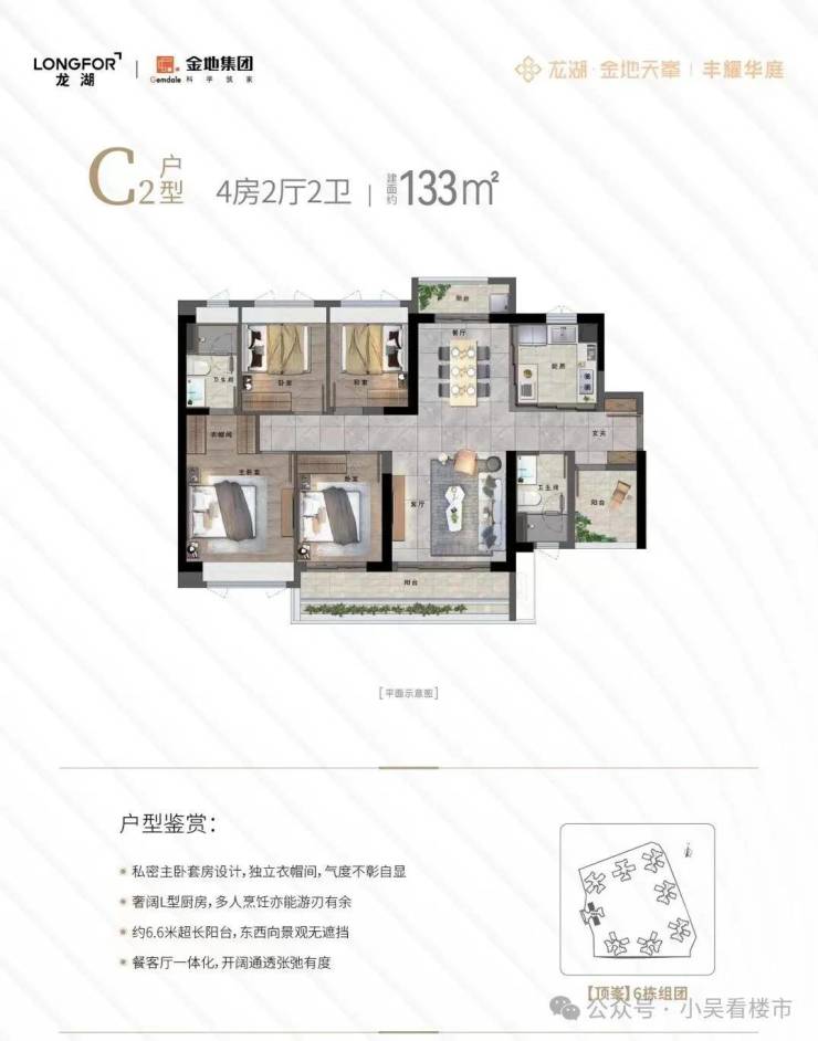 建面133平四+一房两卫,6.6米阳台,超长采光面,餐客厅一体化,主卧带独立衣帽间。