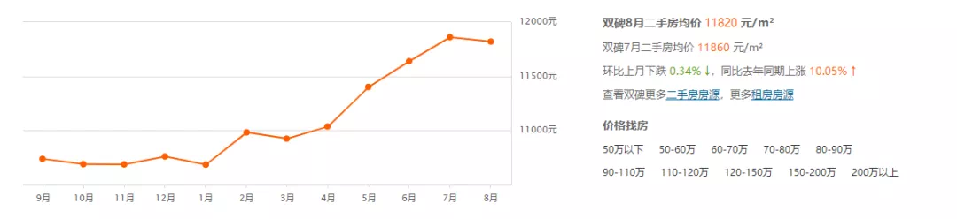 而从安居客的二手房均价走势图看,石井坡-双碑沿线的二手房成交,主要从4月开始呈现连续性上涨的趋势,在7月到达峰值,但均价仍控制在12000元/㎡以内。