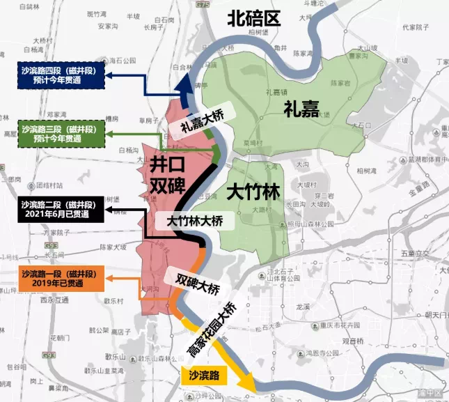 高家花园大桥、石门大桥、双碑大桥、礼嘉大桥(在建)、大竹林大桥(规划)、磁器口隧道、双碑隧道、井口隧道等,彻底打通井双片区与各区之间的瓶颈。