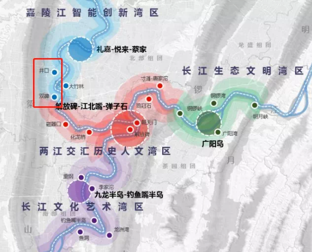 而井双片区作为嘉陵江智能创新湾区的重要节点,在结合沙坪坝文、教、卫等传统优势,挖掘城市山水人文脉络,向智能研发和文化创新转型发展的前提下,规划建成具有“文化传承巴渝风、文教兴盛书卷气、山水融合诗画味、智能创新国际范”的临山滨江湾区。