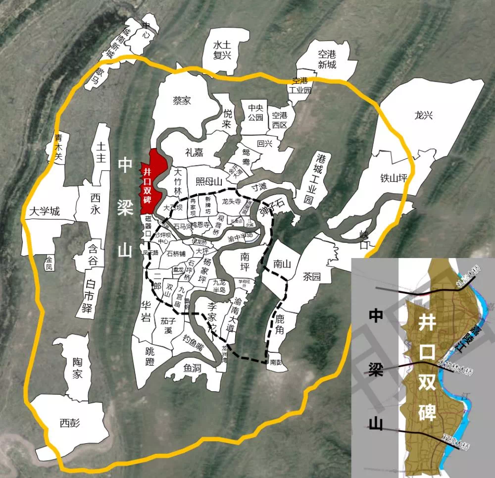 从地理因素看,井双片区属于沙坪坝老城的北向物理延伸,东面与大竹林隔江相望,南面依附三峡广场,西面过了中梁山就是站在城市风口的高新区,北面是蔡家、北碚等,看得出来,井双片区其实是承载了沙坪坝的实际扩张需求。