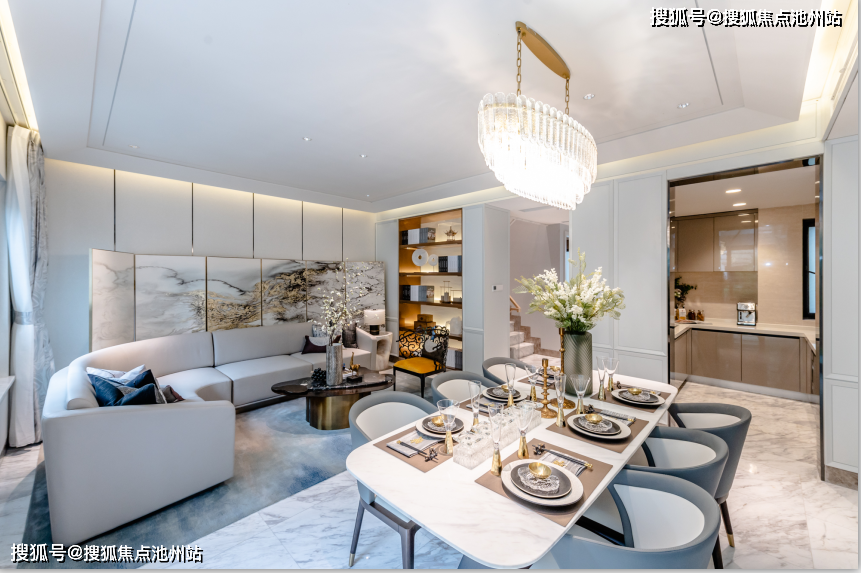 一层独立入户,进门后的餐客一体起居空间,足以容纳一个大家庭的节日聚餐或是一场精致的下午茶party。
