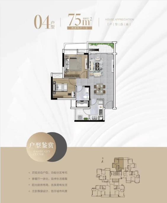 75㎡两房两厅一卫是刚需首选,适合新婚夫妻或三口之家。客厅连南向阳台采光佳,主卧带飘窗空间充足,次卧可灵活改造成儿童房或书房;U型厨房动线流畅,实用又舒适。