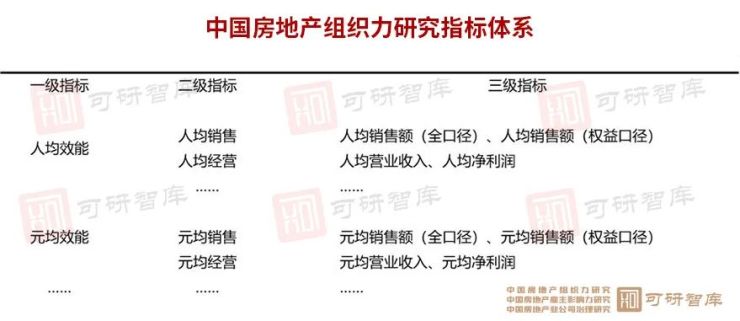 指标体系包含一级指标5项、二级指标10项,三级指标28项,影响指标的相关因素122项,由于指标体系较为复杂,本着抓重点,可量化的原则,可研智库选取其中具有显著影响力且可以进行客观衡量的要素指标(即:“人均效能、元均效能、费均效能、城市深耕效能、运营效率、综合管理水平”等指标,简称:五效一综”)作为组织力的评价标准。