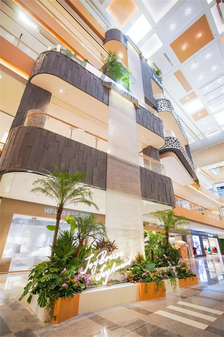 水中庭的视觉中心采用了“穿线水幕”技术,以大自然的瀑布景观为蓝本,打造热情饱满、大气磅礴的生态景观。水沿着金属网自然流动,仿佛鱼鳞波纹,经过光线折射,在绿植的掩映下,形成垂直的绿色生态空间,带来无限想象,将生活美意尽收眼底;