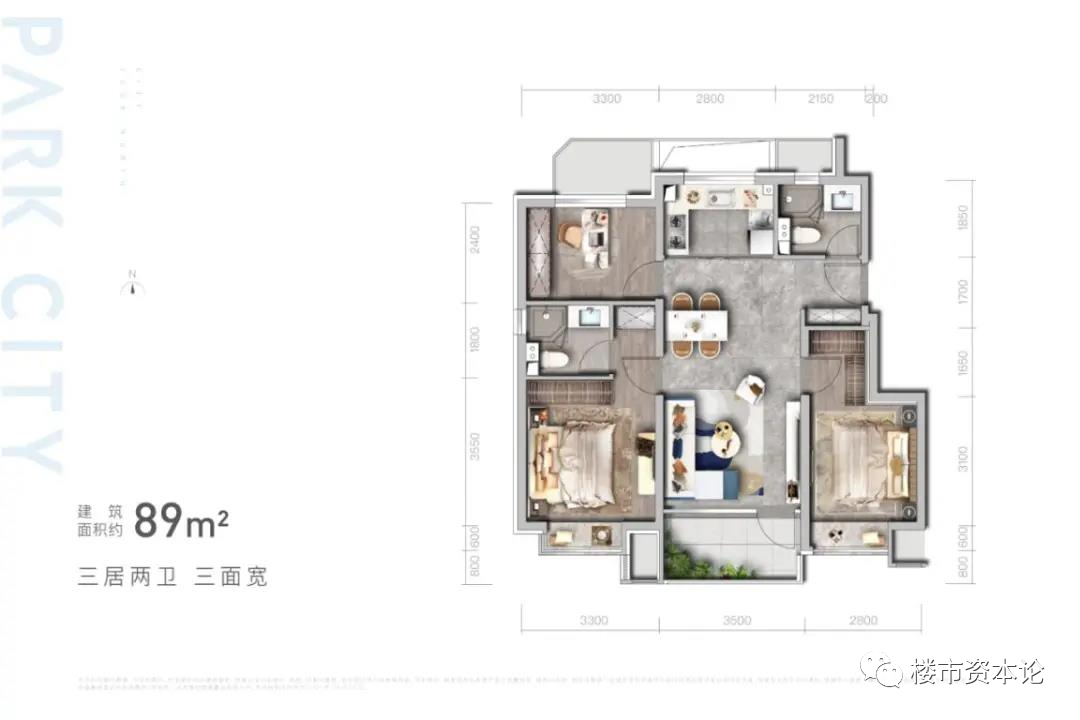 而约89平米的三居,虽然只多了10来平,在居住体验却是两居的plus版——除了“南向三面宽+LDK+南北通透”,还做到了南北双阳台!