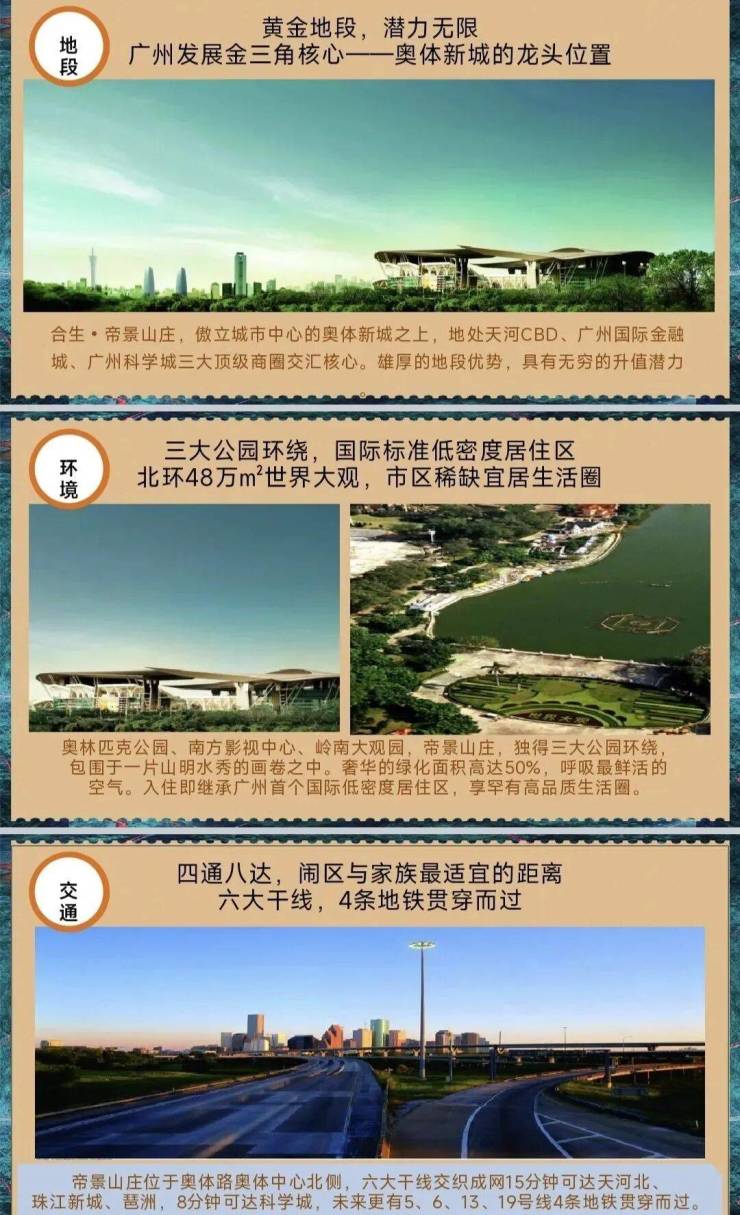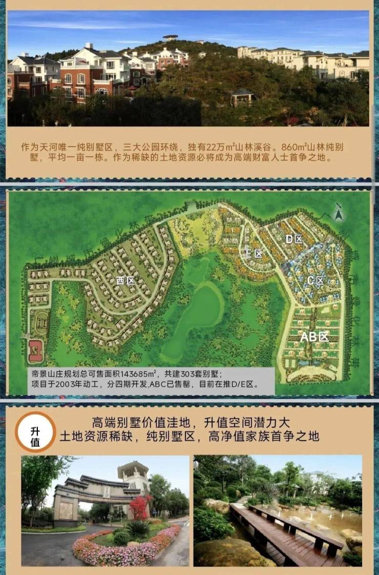 帝景山庄是由合生创展在天河奥体板块开发的低密纯别墅区,小区分为A、B、C、D区以及E区等五个别墅组团,开发周期由2006年至2015年。小区北部靠近科学城,南边邻近金融城,25分钟车程可以到达珠江新城、琶洲,是可以作为第一居所的城市半山别墅。