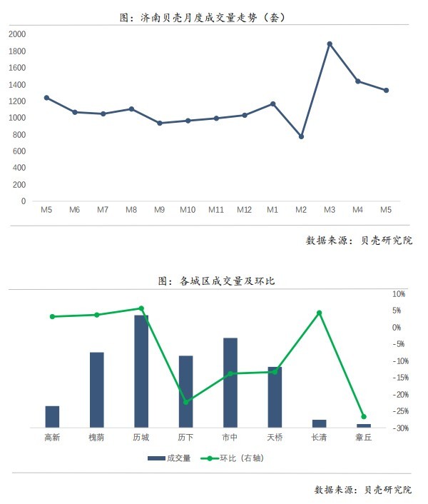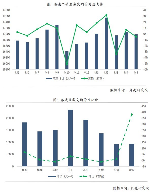 根据贝壳济南站数据显示,5月份济南二手房成交均价为16987元/㎡,环比下降0.48%,成交均价较上月略有下降;在成交方面,济南二手房成交量环比下降7.51%;在 3月份放量、4月较大下降后趋于稳定。