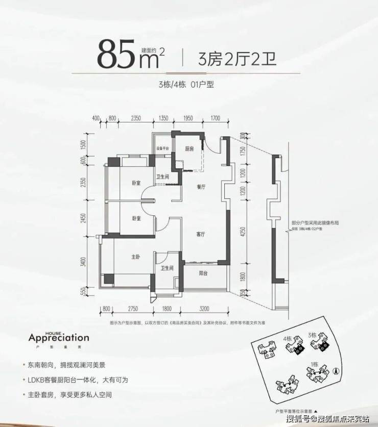 【户型面积】约75-85㎡3房2卫,约94-105㎡4房2卫
