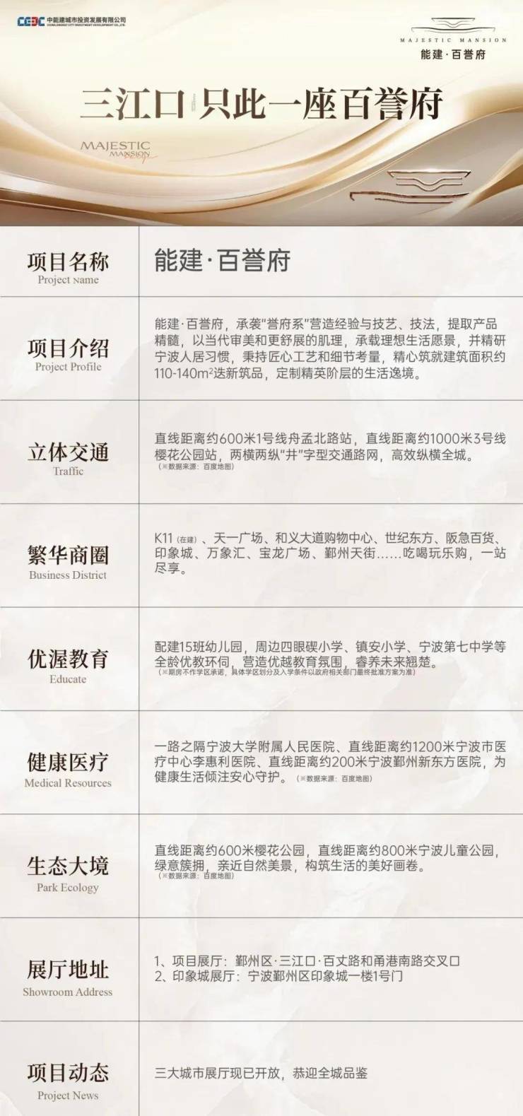 温馨提示:本项目备案名为“百誉府”,推广名为“能建·百誉府”,开发商为“中能建未来社区建设发展 (宁波) 有限公司”。能建百誉府售楼处电话/地址:400-000-0460转7777☎预约热线✔✔✔