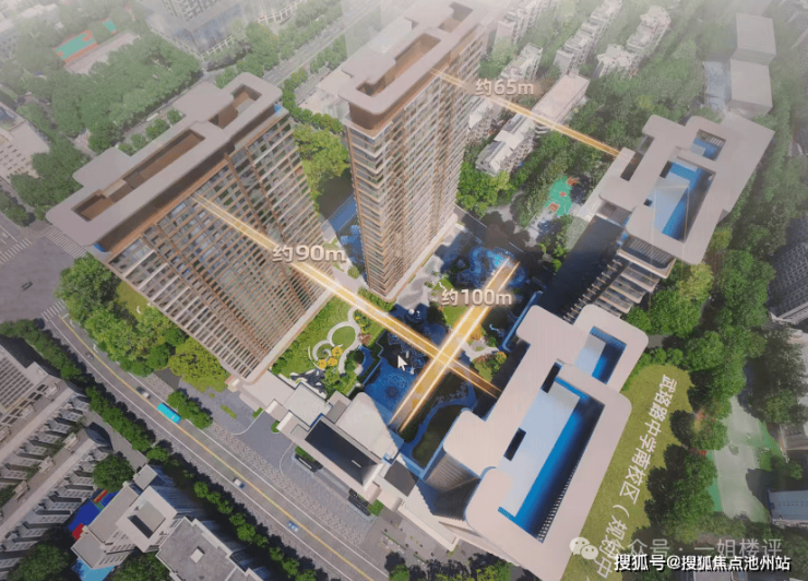 可以看到,项目1、2号楼之间的楼间距约90米,3、4号楼之间也有约65米的间距,而且东西向的纵深也达到约100米,形成完整且方正的园林。